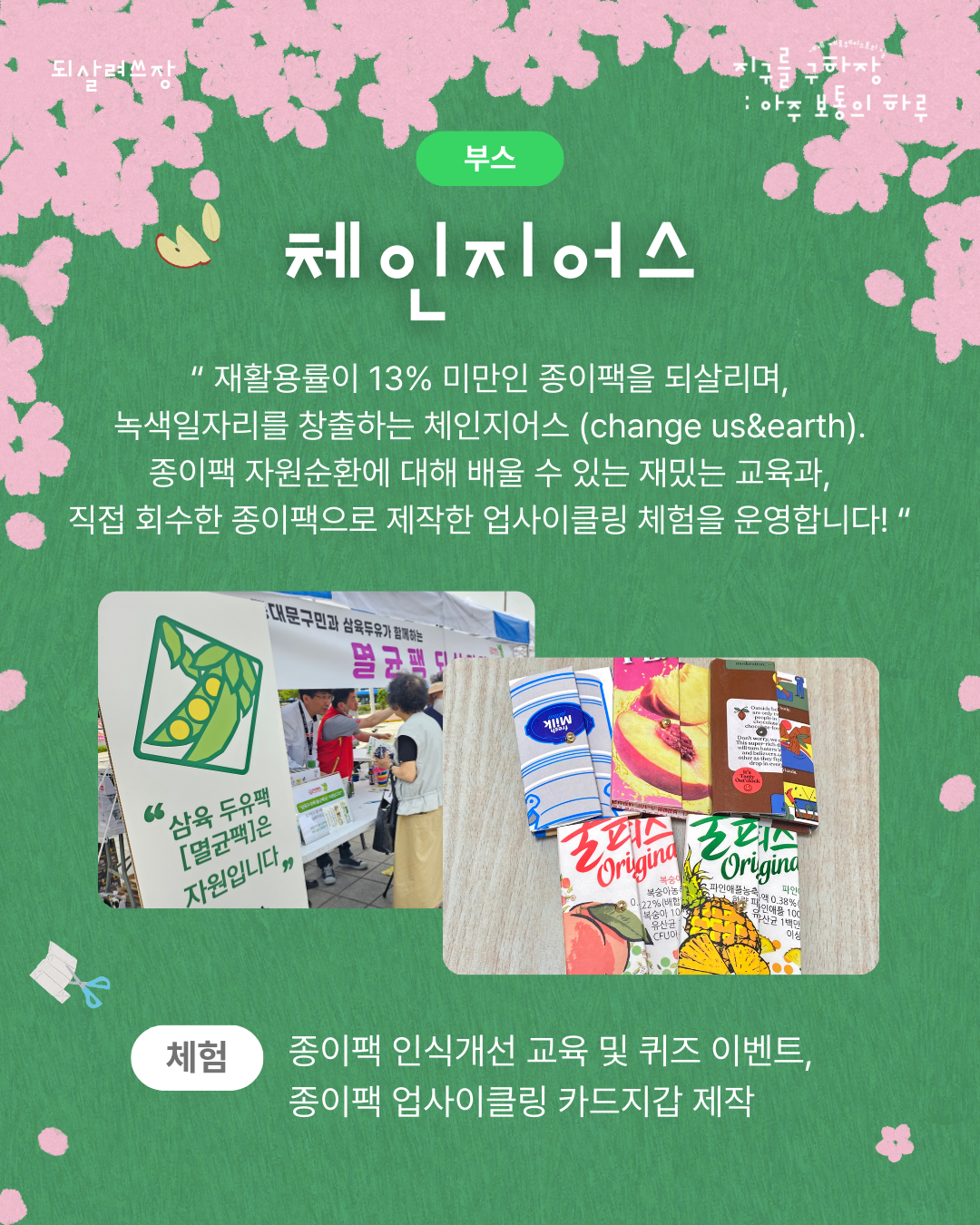 ์ฌํ์ฉ๋ฅ ์ด 13% ๋ฏธ๋ง์ธ ์ข ์ดํฉ์ ๋์ด๋ฆฌ๋ฉฐ, ๋ น์์ผ์๋ฆฌ๋ฅผ ์ฐฝ์ถํ๋ ์ฒด์ธ์ง์ด์ค (change us&earth).